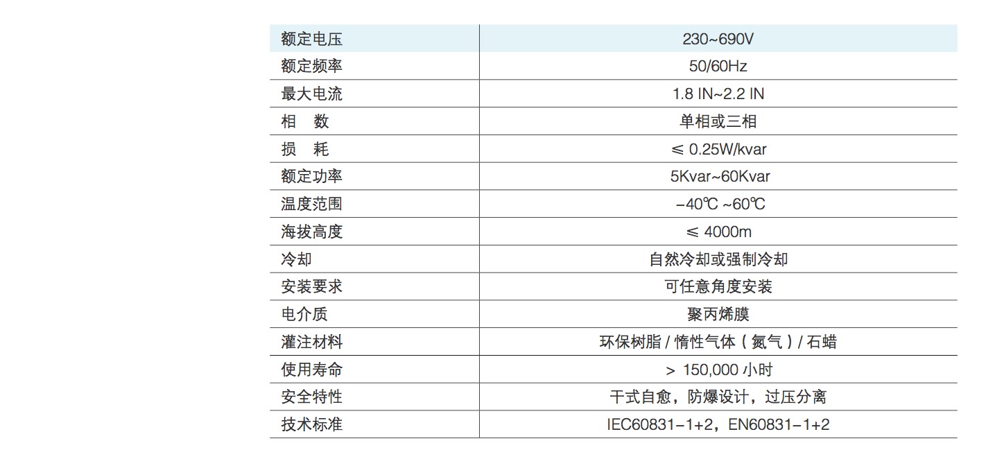 ◆ 多重保护,内置电容器芯体故障保护,使故障安全隔离,特殊的工艺工程及优质环保灌注材料,无油,全干式结构,壳体采用钢板喷塑结构。